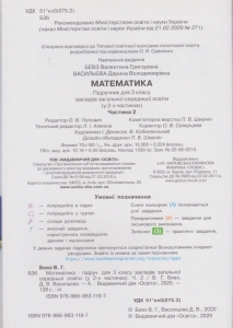 Підручник "Математика" для 3-го класу НУШ (частина 2). Автор: Бевз В., Васильєва Д. Видавництво: Освіта. Програма: НУШ. Рік видання: 2020. Кількість сторінок: 128. Бумага: Офсет. Формат: 70х100/16. Обкладинка: Тверда.